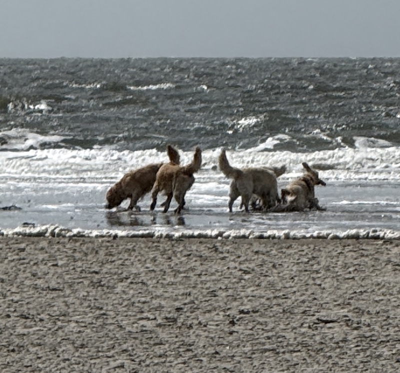 Für uns Zweibeiner genauso wie für unsere vierbeinigen Familienmitglieder war es eine rundum gelungene Zeit: lange Spaziergänge am endlosen Strand, fröhliches Toben, gutes Essen und ganz viel Lachen. Abends haben wir gemeinsam im Restaurant geschlemmt und tagsüber den wohl besten Rhabarberkuchen überhaupt bei Beate und Norbert genossen – vielen herzlichen Dank euch beiden für eure großartige Gastfreundschaft!