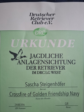 Zum Schluss ging es zum Wasser. Eine nichtsichtig und ohne Geräusch in das Wasser geworfene Ente musste gearbeitet werden.Die Ente lag für Navy vom Ufer aus erreichbar, so dass sie das Wasser nicht annehmen musste/wollte, sondern den bequemen Weg über Land nahm.Da Navy aber nicht geschwommen ist wurde eine zweite Ente sichtig in den Teich geworfen. Natürlich nahm Navy das Wasser sofort an, schwamm zur Ente und hat diese sicher reingebracht.Die Beobachtung der Richter zufolge: Wasserfreude erkennbar. Lassen wir so stehen.