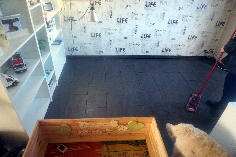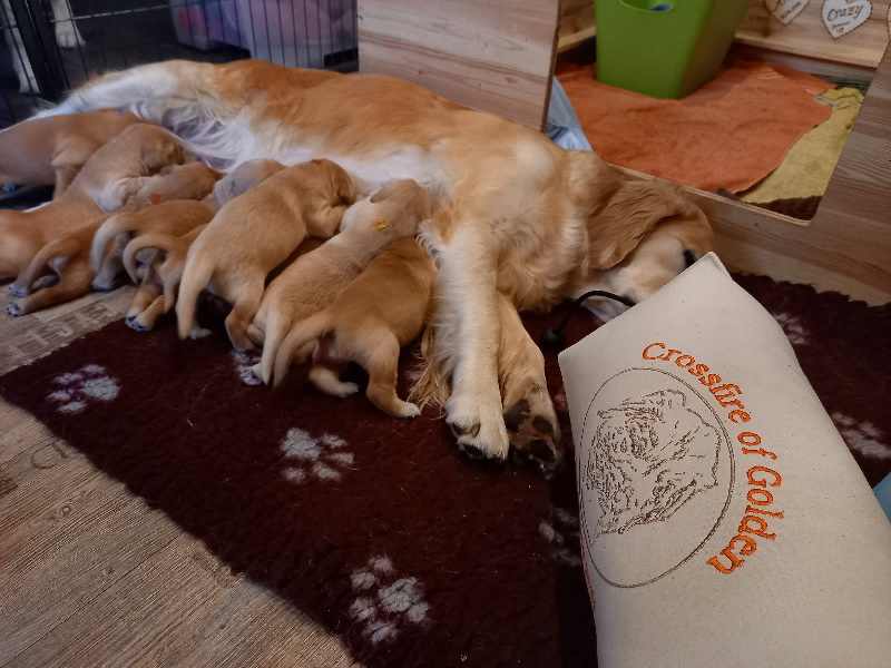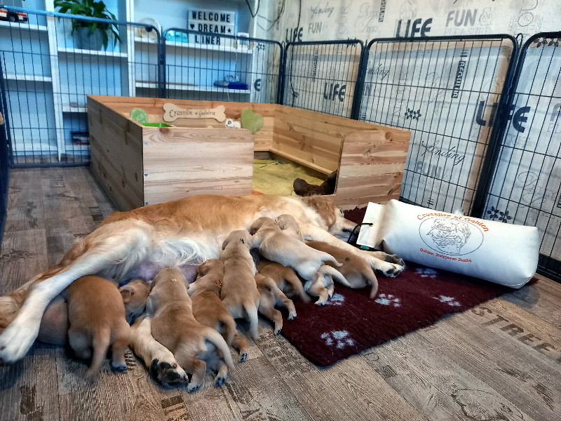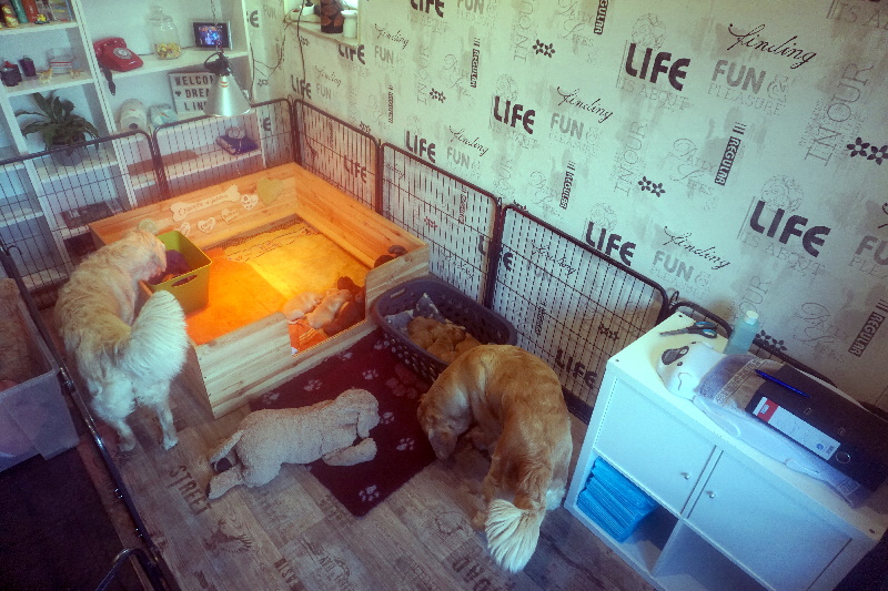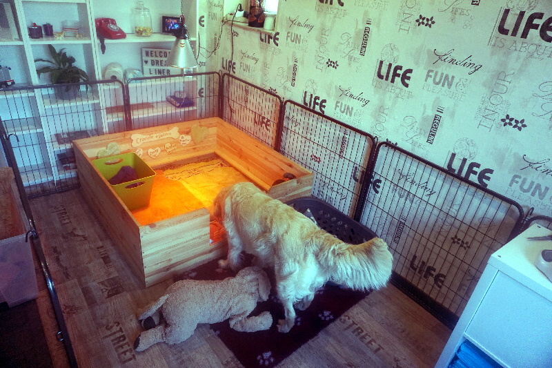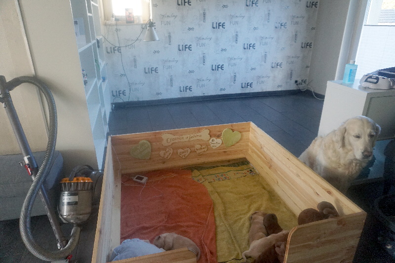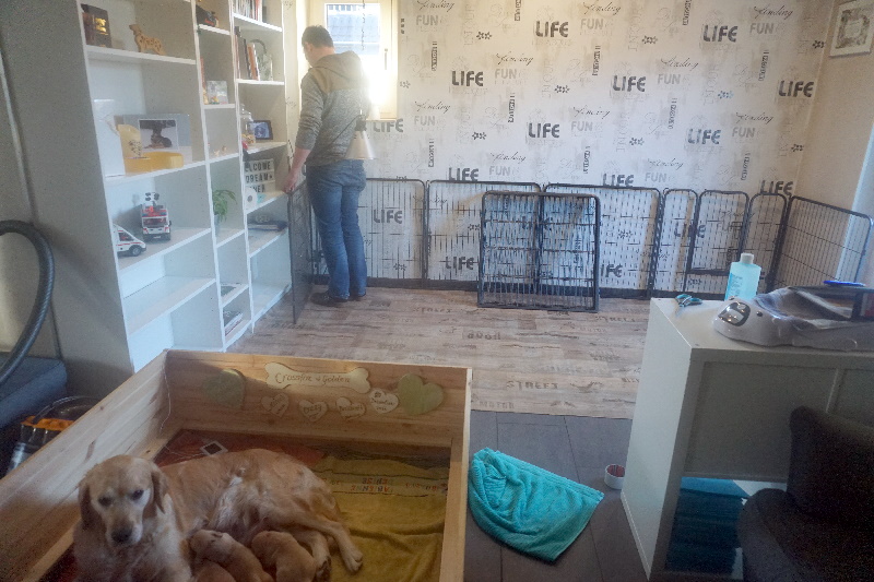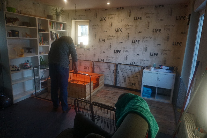 Die Welpen werden mobiler und brauchen demnächst mehr Platz. Dafür haben wir schonmal das kleine Kinderzimmer aufgebaut. Vorteil, Kensi kann sich abseits des Rudels in das Kinderzimmer legen und dort die Dreamliner an die Milchbar lassen.