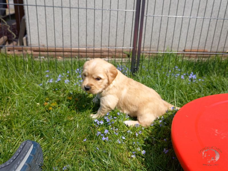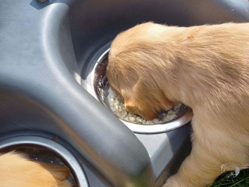 Sobald es etwas wärmer ist, lassen wir die Welpen in den Garten. Es ist wichtig das sie verschiedene Untergründe kennenlernen. Wiese, Steine und Holz. Alles dabei. Aber ohne eine vernünftige Stärkung geht da nichts.