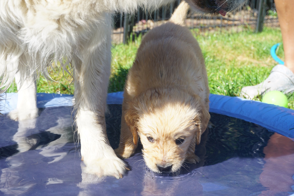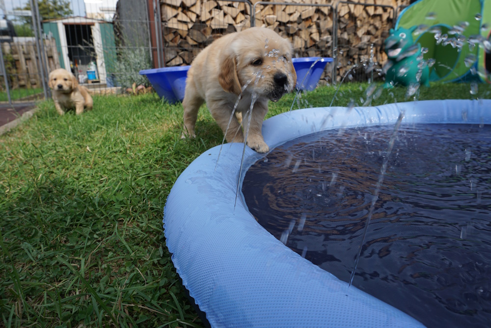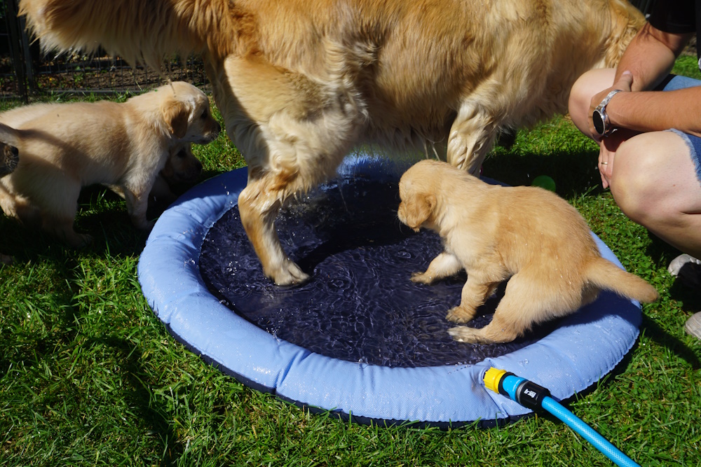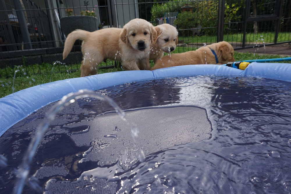 Bei heißen Temperaturen hilft nur eines. Wasser. Und daher war es natürlich Zeit, das das Wasserspielzeug den Weg in den Auslauf findet. Anfangs skeptisch aber später voller Drang ging es ins kühle Naß.