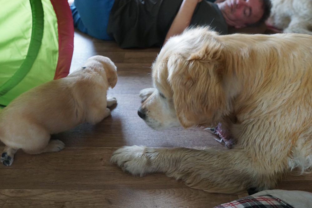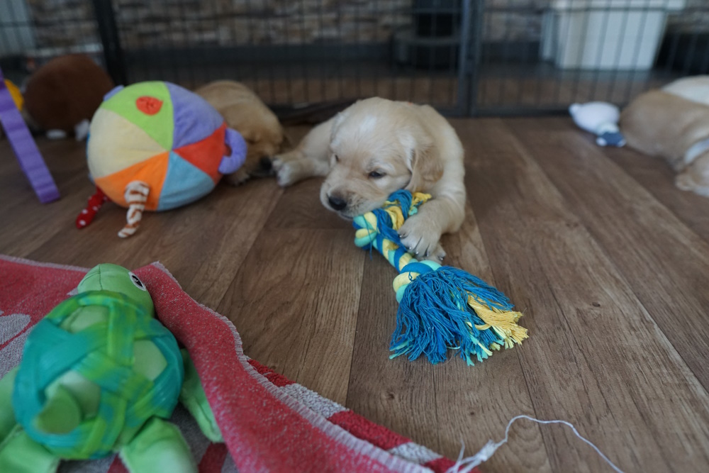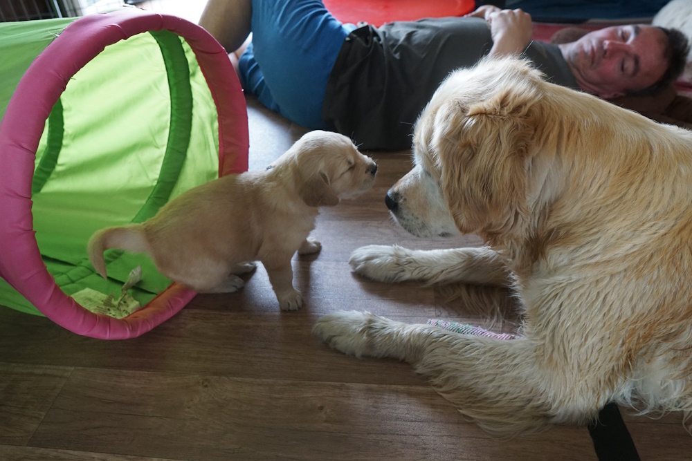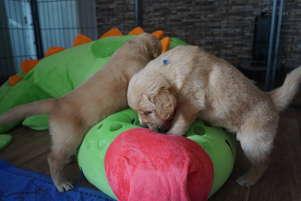 Es ist jetzt egal welches Spielzeug, Stofftier oder Decke in den Auslauf gelegt wird. Alles wird ganz genau untersucht, angeknabbert und teilweise auch schon getragen. Am Knotentau wird fleißig gezergelt und die Füße der Menschen sind auch nicht mehr sicher. Und wehe die Zwerge sehen die Kamera und den dazugehörigen Gurt. Auch der eignet sich super zum spielen und zergeln.Jetzt beginnt eine ganz spannenden Zeit.