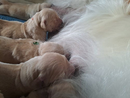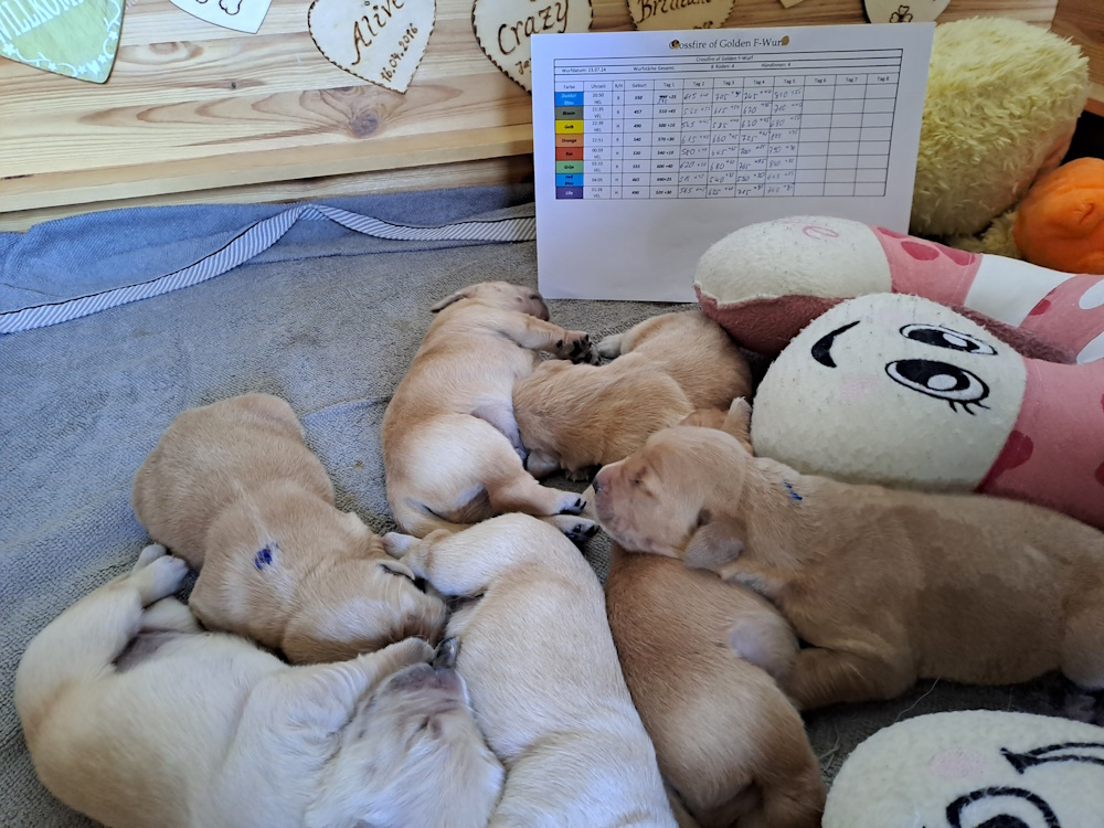 Als erstes wollte Rüde hell Blau um 20:50 Uhr auf die Welt. Gefolgt von Rüde Braun, Frau Gelb und Rüde Orange. Die Nacht zu Tage gemacht haben Frau Rot, Frau Lila, Rüde Grün und um 04:05 Uhr die hell Blau markierte Hündin.