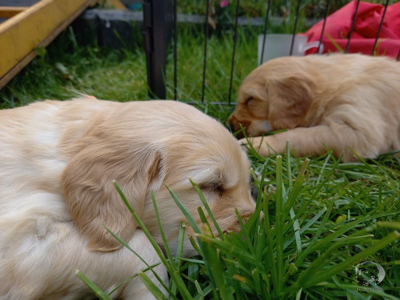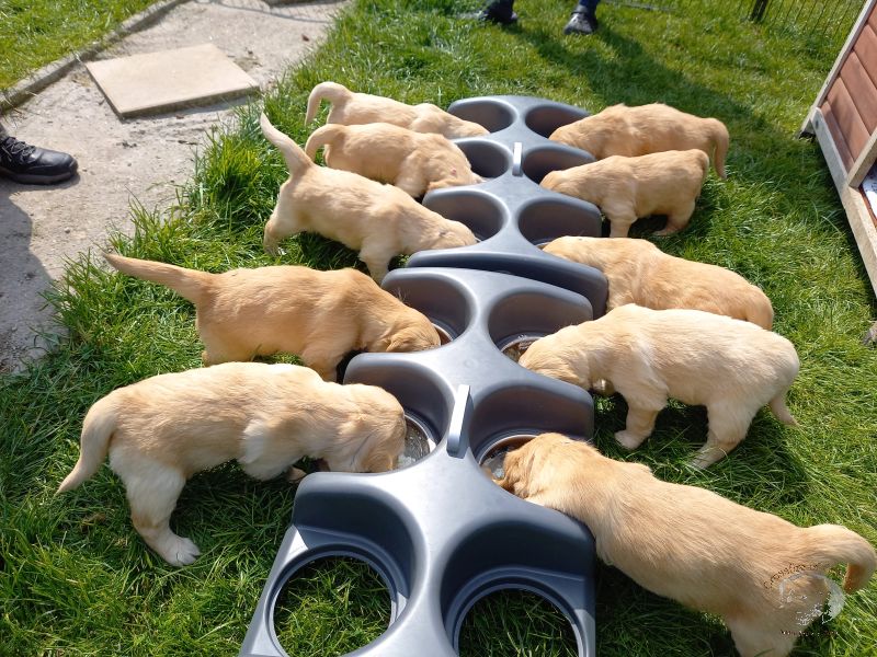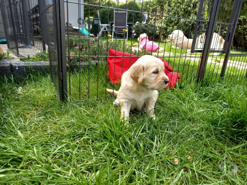 Sobald es etwas wärmer ist, lassen wir die Welpen in den Garten. Es ist wichtig das sie verschiedene Untergründe kennenlernen. Wiese, Steine und Holz. Alles dabei. Aber ohne eine vernünftige Stärkung geht da nichts.