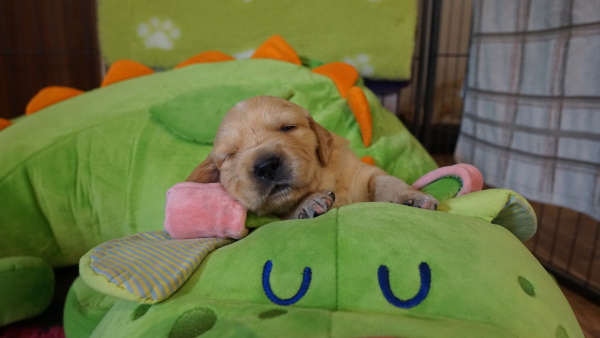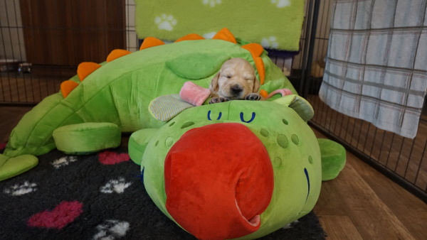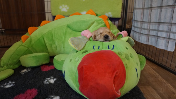 Heute ist Fridolin eingezogen. Fridolin ist ein kleiner lieber Drache der uns seit unserem C-Wurf begleitet. Die Welpis lieben es auf ihn zu klettern und vorallem zu schlafen.