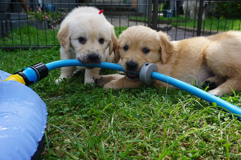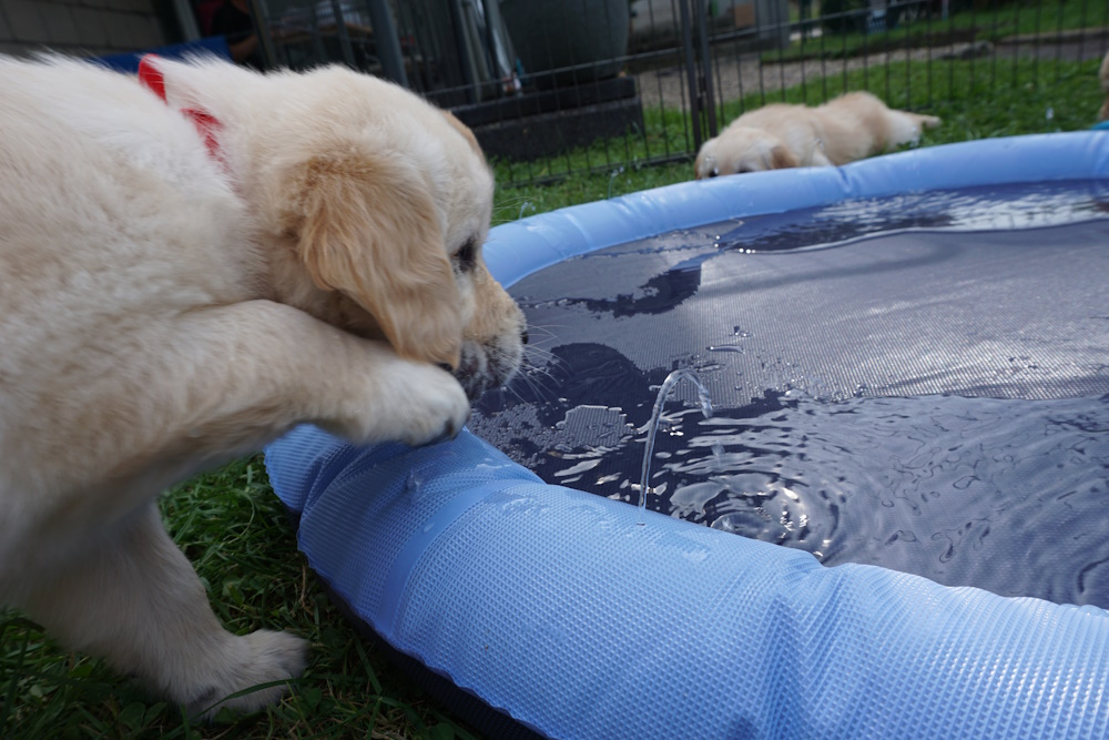 Bei heißen Temperaturen hilft nur eines. Wasser. Und daher war es natürlich Zeit, das das Wasserspielzeug den Weg in den Auslauf findet. Anfangs skeptisch aber später voller Drang ging es ins kühle Naß.