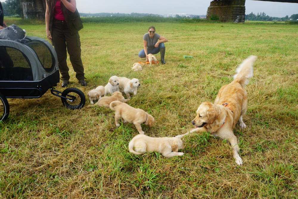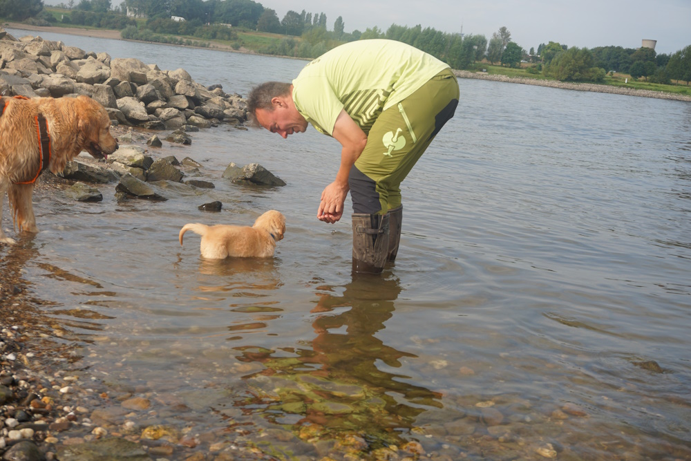 Am Dienstag waren wir mit den Welpen im Rheinvorland unterwegs. Nachdem wir auf der Wiese den ersten Dampf rausgelassen haben, haben wir uns an einer seichten Stelle an das Wasser getraut. Ganz mutig sind die Zwerge über den Kies gehoppelt und haben sich auch in das Wasser getraut. Der ein oder andere hat sogar sein Seepferdchen schon gemacht.Vielen Dank an Ulrike und Sarah für euren Einsatz und Hilfe.