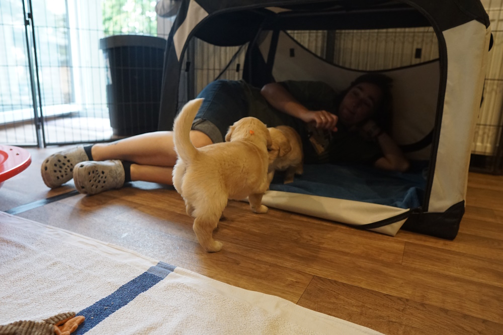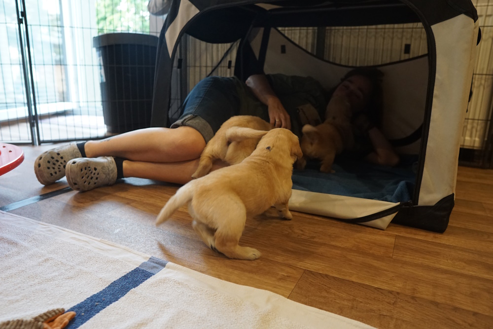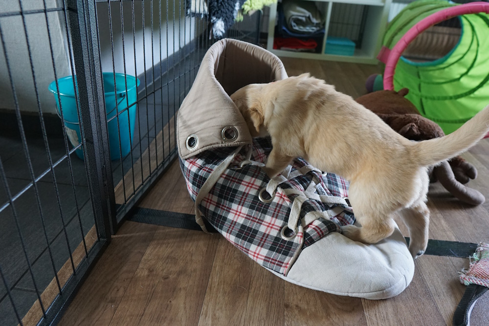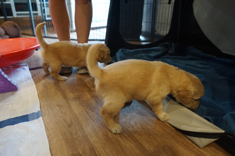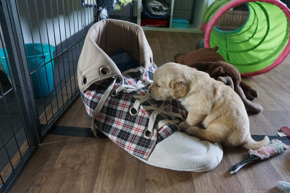 Schon seit einigen Tagen liegen die Welpen überall rum zum schlafen. Auch Nachts suchen sie sich ihren Platz. In der Wurfkiste lag meisten die Uroma Ziva oder wurde genutzt wenn wir alles geputzt haben.Deshalb haben wir die Kiste heute abgebaut und durch einen Kennel ersetzt.