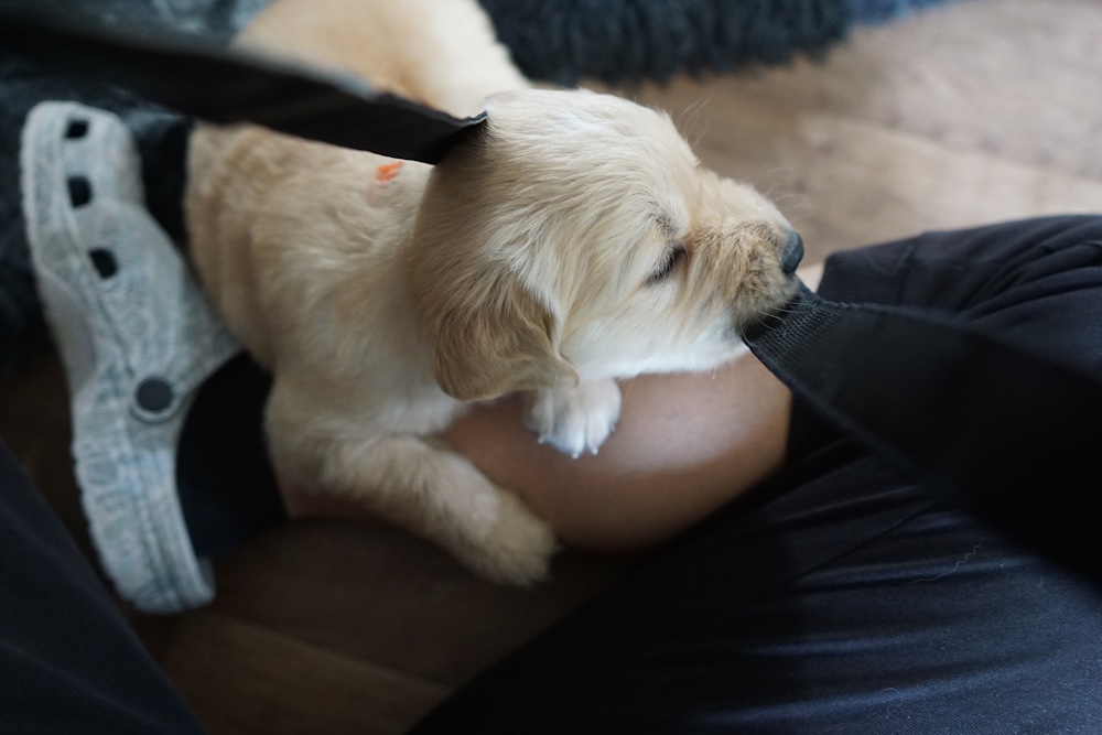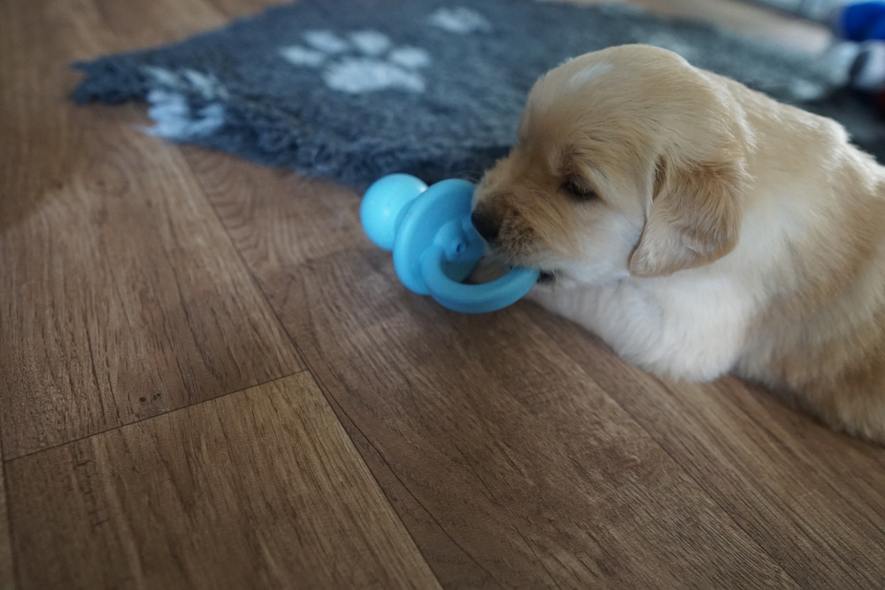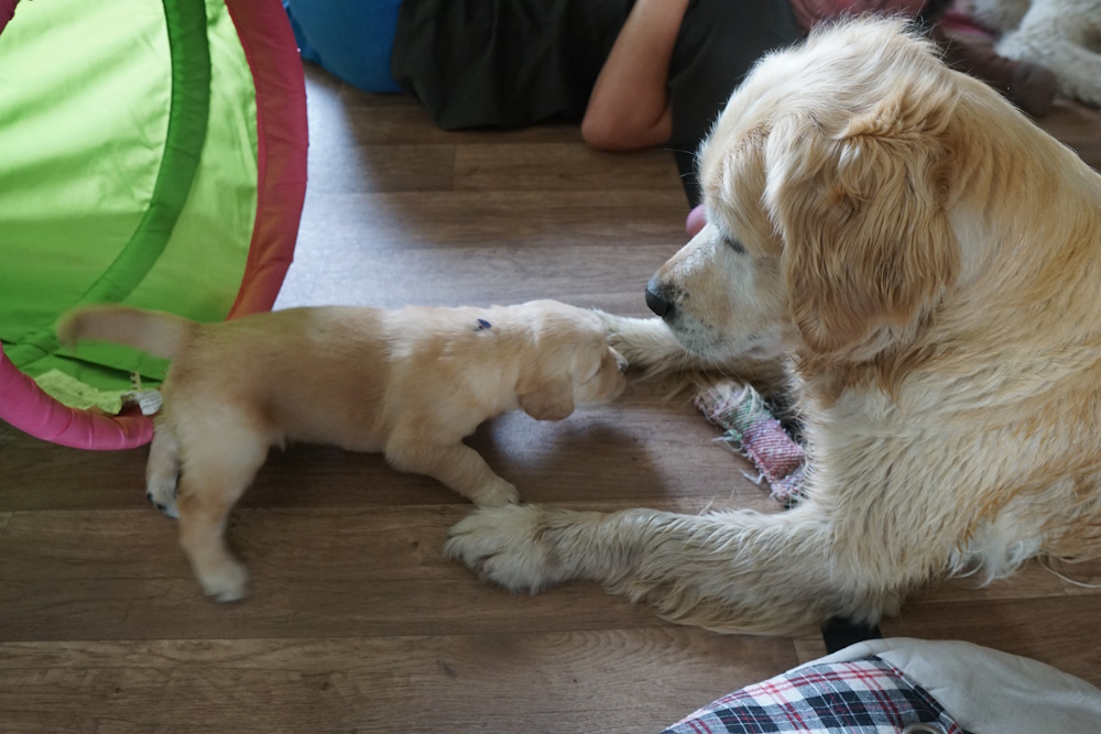 Es ist jetzt egal welches Spielzeug, Stofftier oder Decke in den Auslauf gelegt wird. Alles wird ganz genau untersucht, angeknabbert und teilweise auch schon getragen. Am Knotentau wird fleißig gezergelt und die Füße der Menschen sind auch nicht mehr sicher. Und wehe die Zwerge sehen die Kamera und den dazugehörigen Gurt. Auch der eignet sich super zum spielen und zergeln.Jetzt beginnt eine ganz spannenden Zeit.