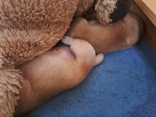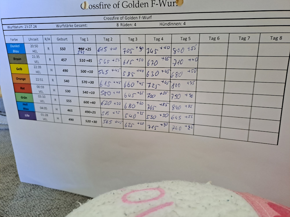 Als erstes wollte Rüde hell Blau um 20:50 Uhr auf die Welt. Gefolgt von Rüde Braun, Frau Gelb und Rüde Orange. Die Nacht zu Tage gemacht haben Frau Rot, Frau Lila, Rüde Grün und um 04:05 Uhr die hell Blau markierte Hündin.