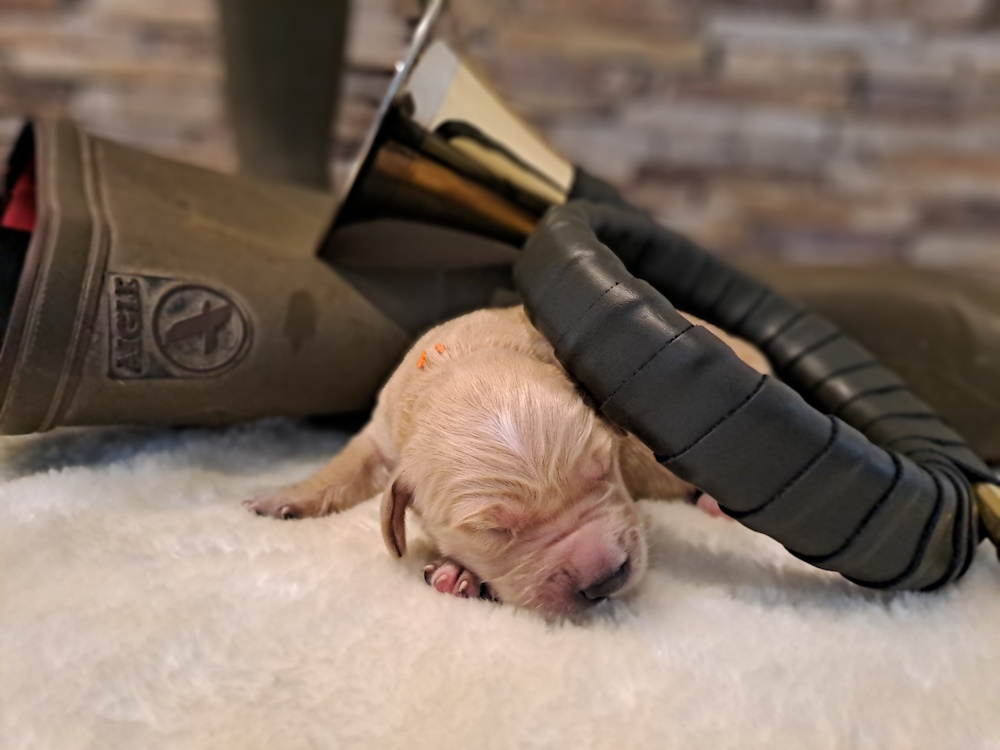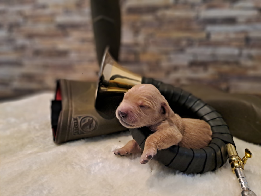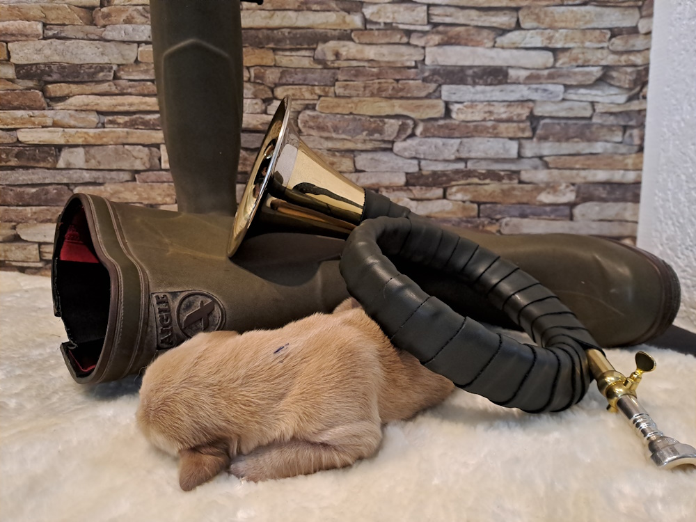 Heute ist schon der dritte Tag und ein richtiger Jagdhund darf schonmal das Jagdhorn kennenlernen.